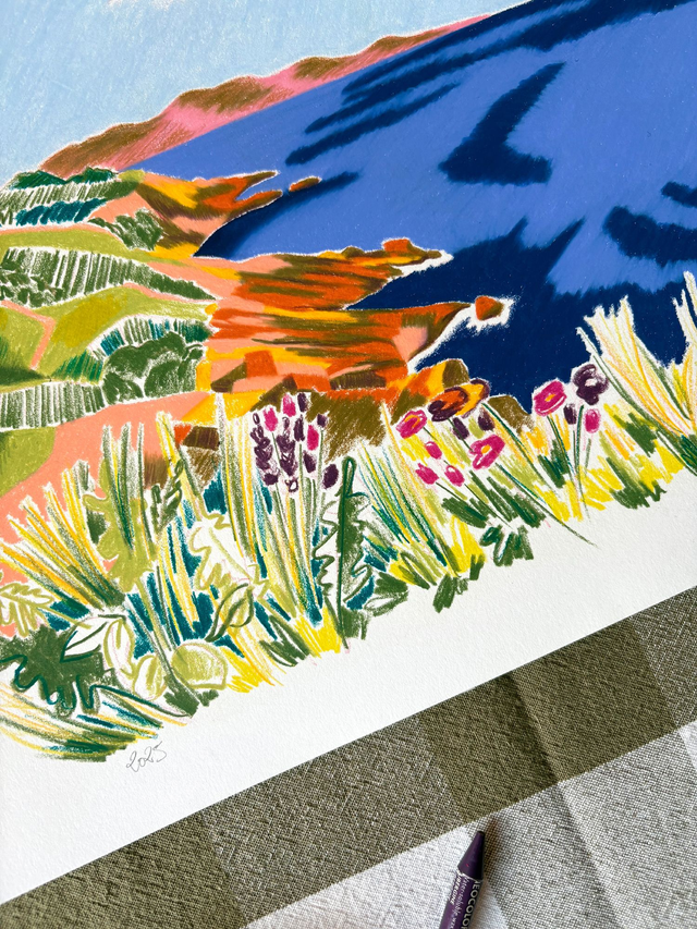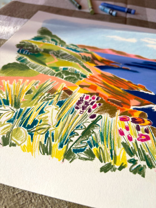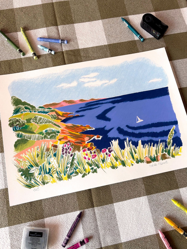 « Vers la mer » est une œuvre originale au pastel à la cire, inspirée d’un sentier en hauteur face à l’océan. Rochers, végétation et chemin se répondent, tandis qu’un bateau minuscule glisse au loin sur l’horizon.