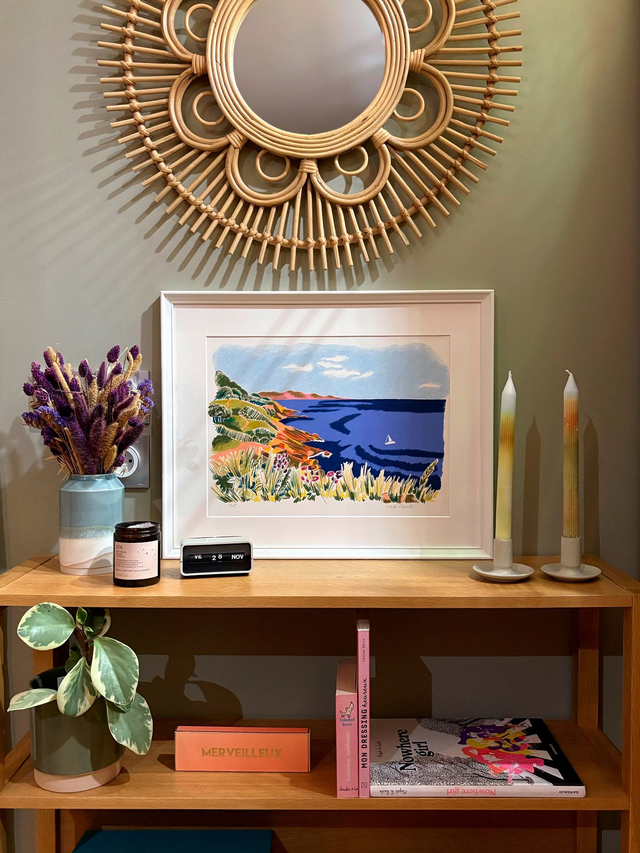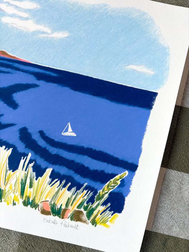 La matière du pastel fait vibrer une lumière douce et une palette chaude de fin d’été. Cette pièce unique capture l’apaisement et la sensation d’espace que l’on ressent face à la mer.